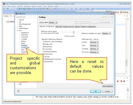The Findbugs Eclipse Plug-In offers various opportunities for customization of how to show and filter warnings. (see Figure 3). It is worth to spend some time to see the differences with changed parameters.
