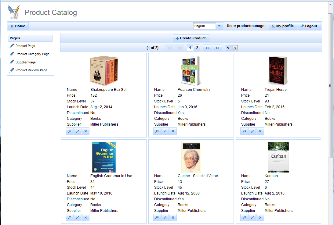 Please explore the Product Catalog and compare it with the values entered in the generjee tool to understand what was generated from our definitions. Please login with "productmanager" (password "productmanager") to get the full functionality access. Let me point out some features worth mentioning: