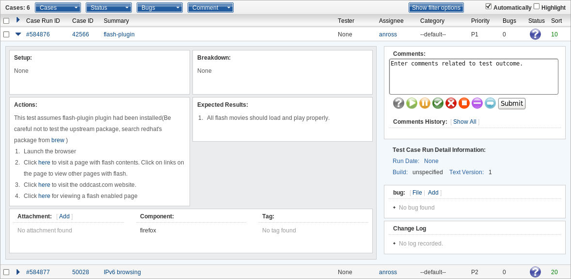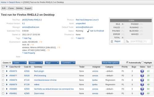 Test Run – Test Runs are created for a specific Test Plan and product build. Only Test Cases with a status of CONFIRMED will be added to the Test Run. A Test Run can be assigned to any user in Nitrate. Individual test cases inside a Test Run can be tested and commented on by other users as well.