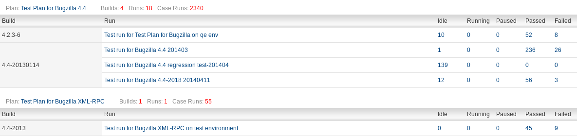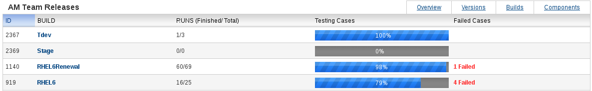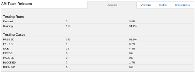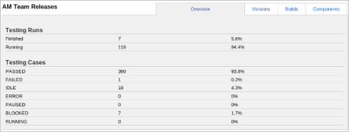 The overall report provides a high-level information about specific product: how many test cases were tested and what the results look like. It is possible to display the results per version, per build or per product component. Each detailed view shows stats about Plans, Cases and Runs and a Progress with passed/failed cases.