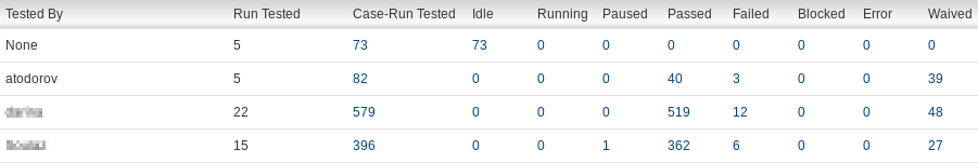 The testing report is used to extract more information about testing. It is possible to filter the results per product, version, build and execution dates. There are several available views showing testing status per tester, per case priority and plan tag. In addition views can be grouped by build and plan where applicable. Each of the testing report views displays stats about different test cases statuses (PASSED, FAILED, BLOCKED, IDLE, etc).