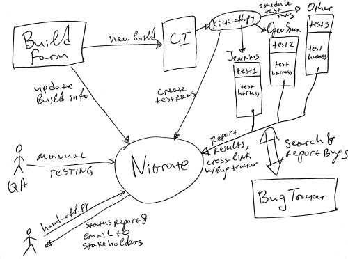 One particular environment I have been part of and where Nitrate is heavily used, it is integrated in the following pipeline: