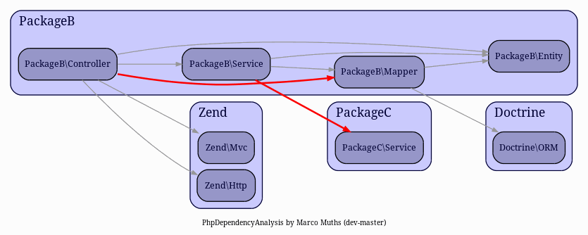 PhpDependencyAnalysis is an extendable open source static code analysis tool for object-oriented PHP projects. It builds a dependency graph for abstract datatypes (classes, interfaces and traits) based on their namespaces. Abstract datatypes are aggregatable to units on a higher level, like layers or packages. It detects cycle dependencies and verifies the graph against a custom architecture definition.