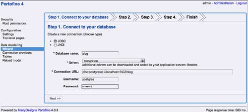 If you have an existing database (or more than one), then you can use the wizard and let Portofino create pages automatically. Launch the wizard procedure from the home page. Connect via JDBC and follow the four steps of the wizard.