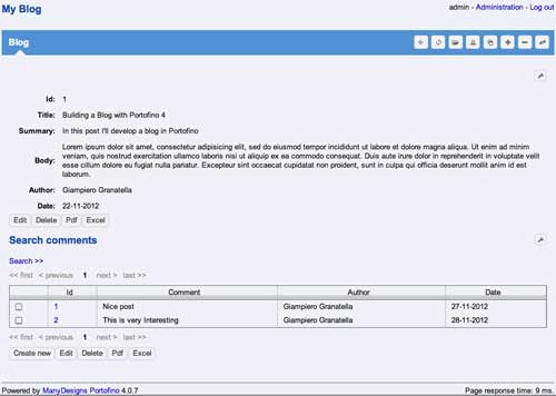 Analyzing foreign keys, Portofino organizes the pages hierarchically. Subordinate records will be positioned under their master record (e.g. "Customers" will be under "Companies", or "Comments" will be under "Blog Posts" like in the following picture).
