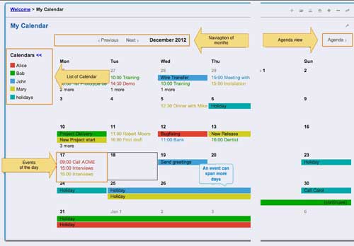 Many components of Portofino let you show the data with a particular view. A calendar page shows events in a monthly or agenda view. Events may be taken from the database or from other sources. Any temporal data can be an event, e.g., the milestones of a project, the due date of a payment, the shipment date of a product. An application can have more calendars and events can be related to a user or a group of users. See the picture below for an example.