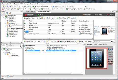 - The file view (large window right) shows the content of the selected item from the two other windows. You can create or adapt a recording module, write code modules or view a test report. In the example below, the upper part shows the test actions and the lower part the repository items for a test on the Amazon.com web site.