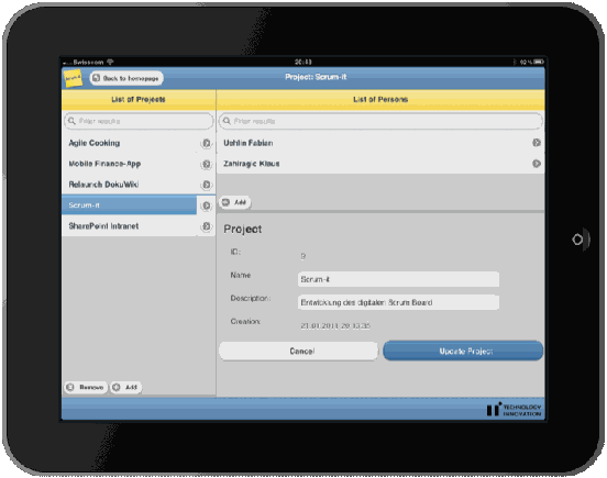 Although software-based solutions that fix most common problems are available on the market, those typically desktop-based applications lack the board as the central communicative element. The new Scrum-it application can eliminate the limitations of current software. Its concept combines the advantages of software and modern touch-screen technology, as both conventional PCs and tablet devices (like the iPad) are fully supported.