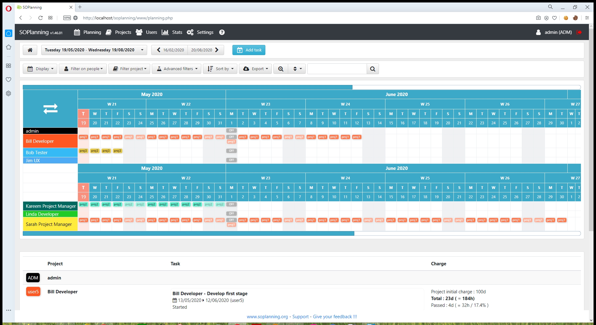 Installing SO Planning is easy. You need to transfer the software in the folder of your Apache installation. Then when you point for the first time to the soplanning directory in your browser, the tool will launch an install script that creates your database. You can then login with the default administrator credentials. The installation has a set of demo data, so you can quickly understand how the tool works.