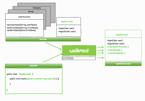 The following example shows how to build a simple facade pattern with "create" methods for each entity type ("UserAccount", "Group", "Company", …) using Walkmod. For each of them, the template engine produces always the same Java class "AppServices" with just one method called "createXXX", where "XXX" is the name of an entity type. After executing a transformation, if it is mergeable, Walkmod will merge the produced output with the existent content.