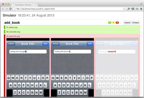 Zucchini works by compiling all the CoffeeScript source files into a single UIAutomation-compatible JavaScript file which it executes on a device or on the iOS Simulator through the Instruments command line tool. As the script finishes, it uses ImageMagick to mask and to compare the screenshots.